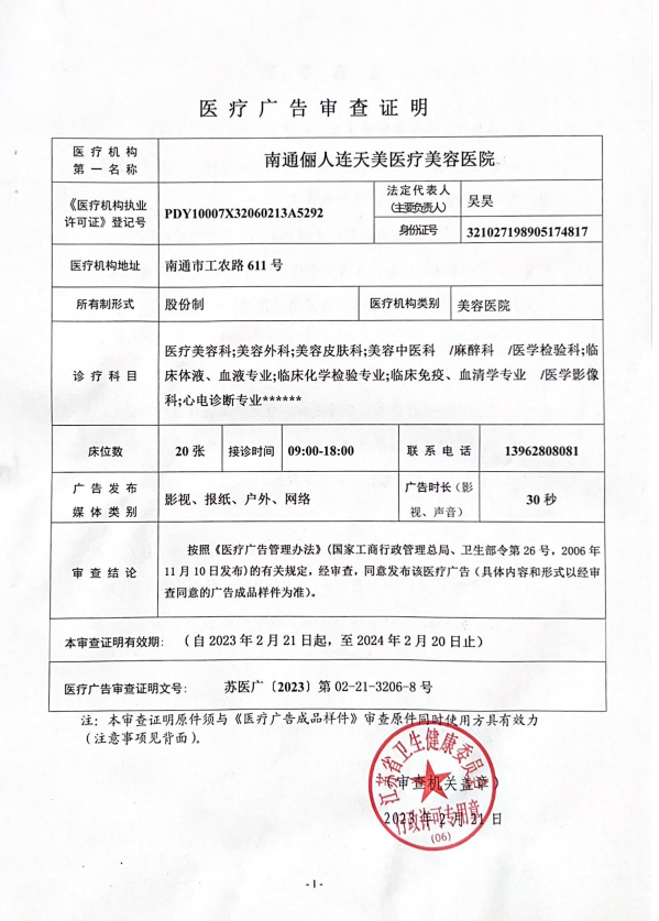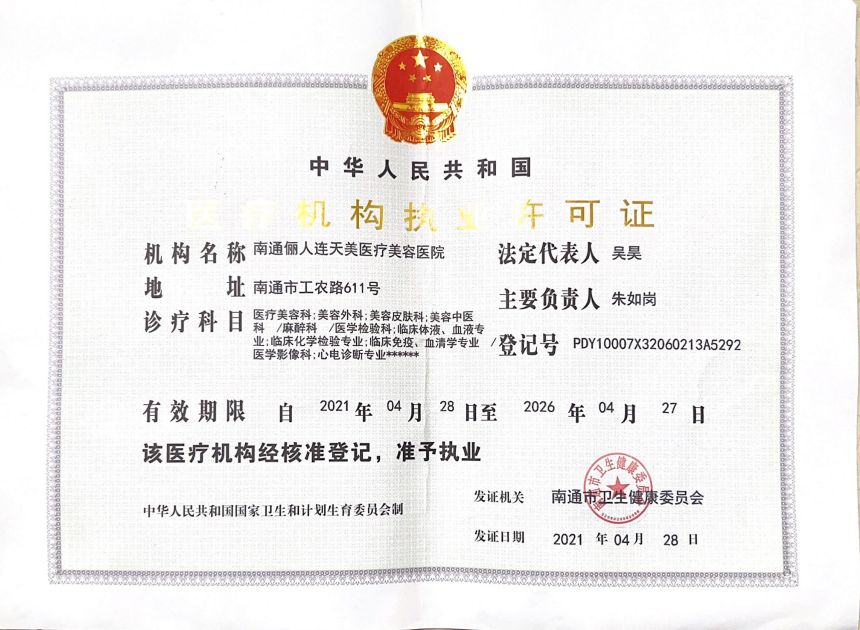 南通儷人連天美醫(yī)療美容醫(yī)院是與著名的醫(yī)療美容集團(tuán)合作建立的醫(yī)院,醫(yī)院提供高品質(zhì)的醫(yī)療美容服務(wù)。2008年,南通儷人連天美醫(yī)療美容醫(yī)院落戶南通,成為由南通衛(wèi)生局審批的專業(yè)醫(yī)療美容醫(yī)院。南通儷人連天美醫(yī)療美容醫(yī)院,特別設(shè)有專業(yè)的整形美容科、皮膚美容科和微創(chuàng)美容科三大科室,致力于為廣大求美者提供全方位的醫(yī)療美容服務(wù)。南通儷人連天美醫(yī)療美容醫(yī)院為求美者建立個人終生美麗檔案,一對一進(jìn)行細(xì)致服務(wù)。 11年來,南通儷人連天美醫(yī)療美容醫(yī)院,不斷引進(jìn)先進(jìn)設(shè)備,不斷完善醫(yī)美技術(shù),一批優(yōu)秀、專業(yè)而穩(wěn)定的醫(yī)生團(tuán)隊,為無數(shù)求美者鑄就美麗夢想。